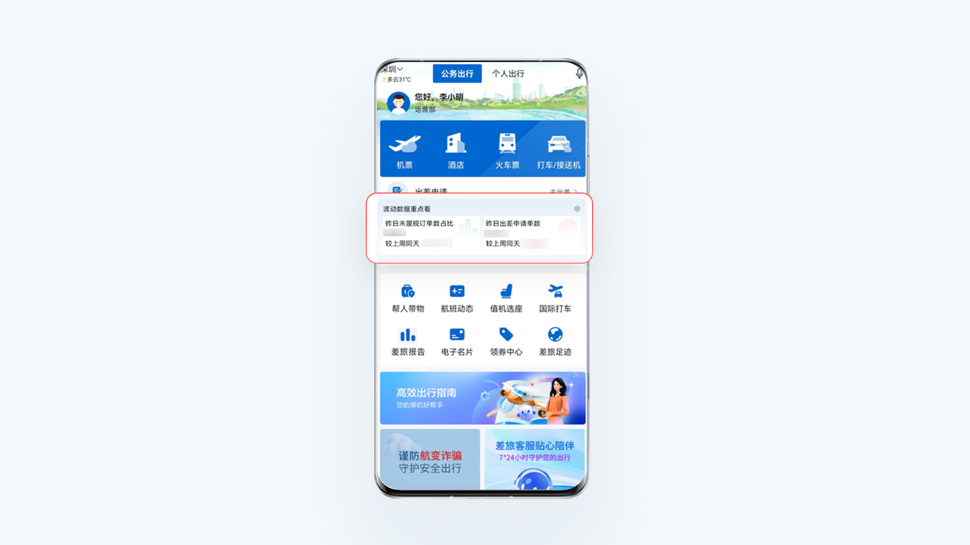 点击“总体概况”,进入该界面后切换导航栏,查看机票、酒店、火车、用车、出差申请单相关数据;