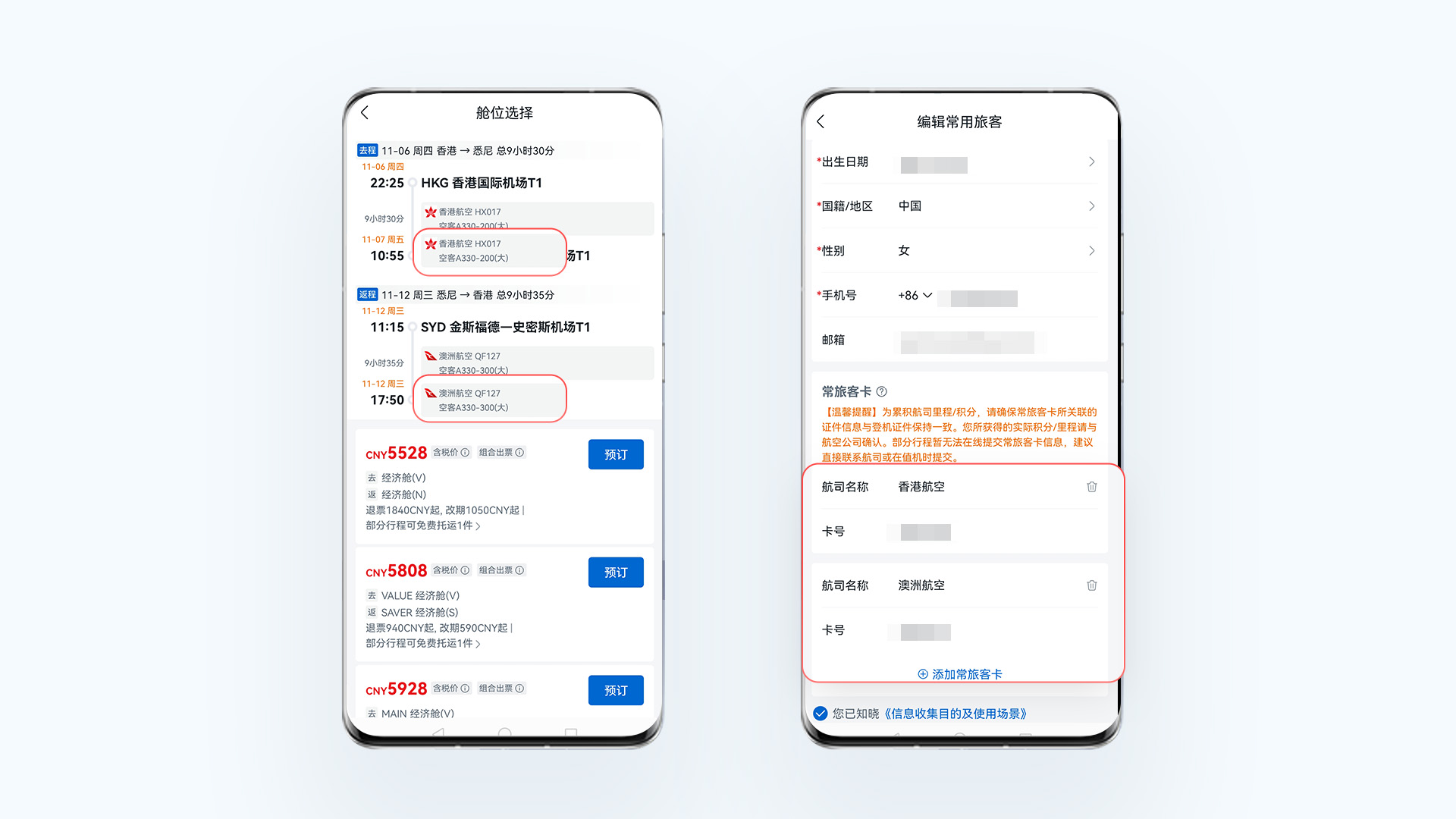 ③预订国际机票组合出票时,可前往“个人中心-常用旅客”添加多个常旅客卡,方便积累航司里程、积分等。