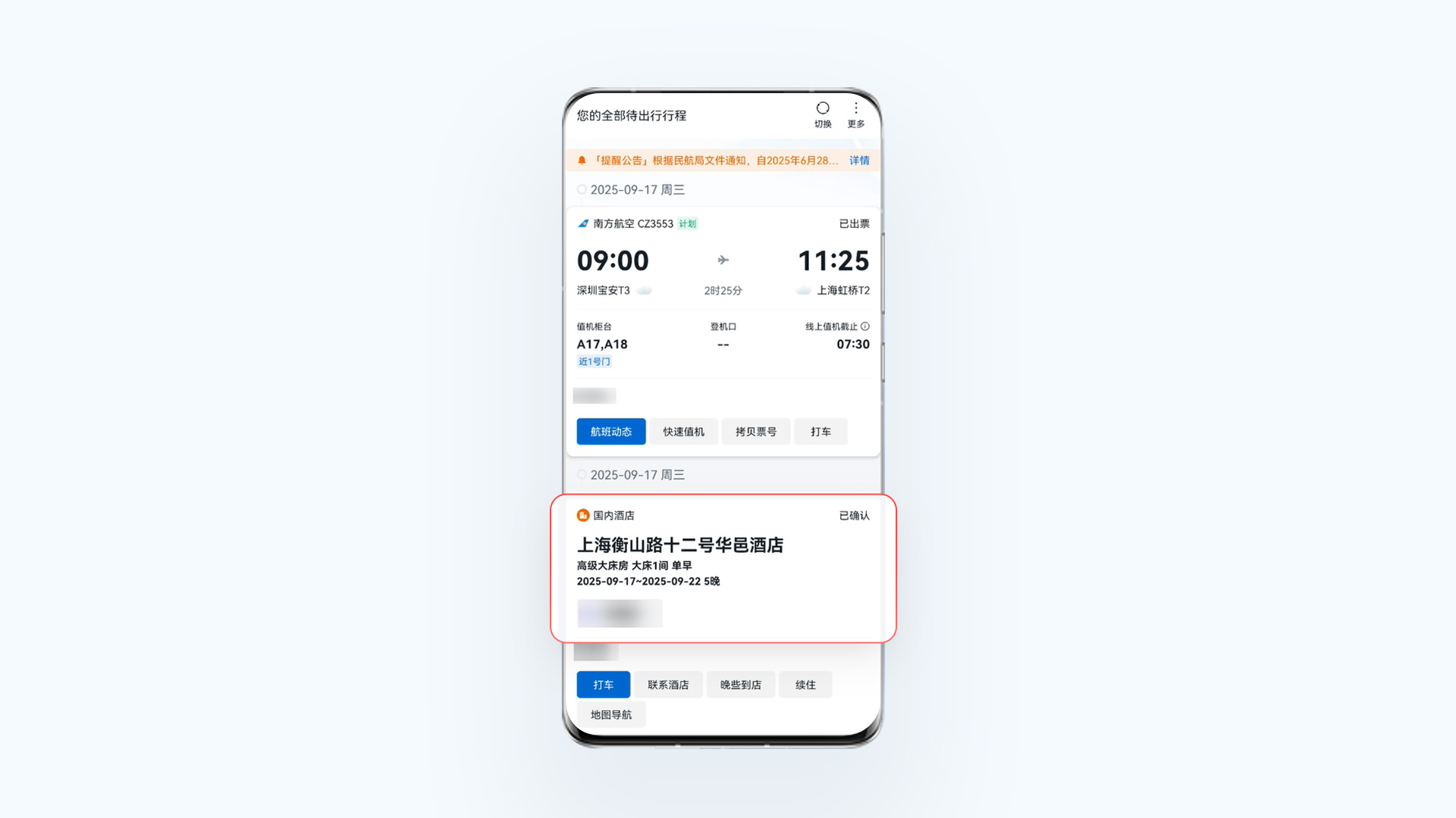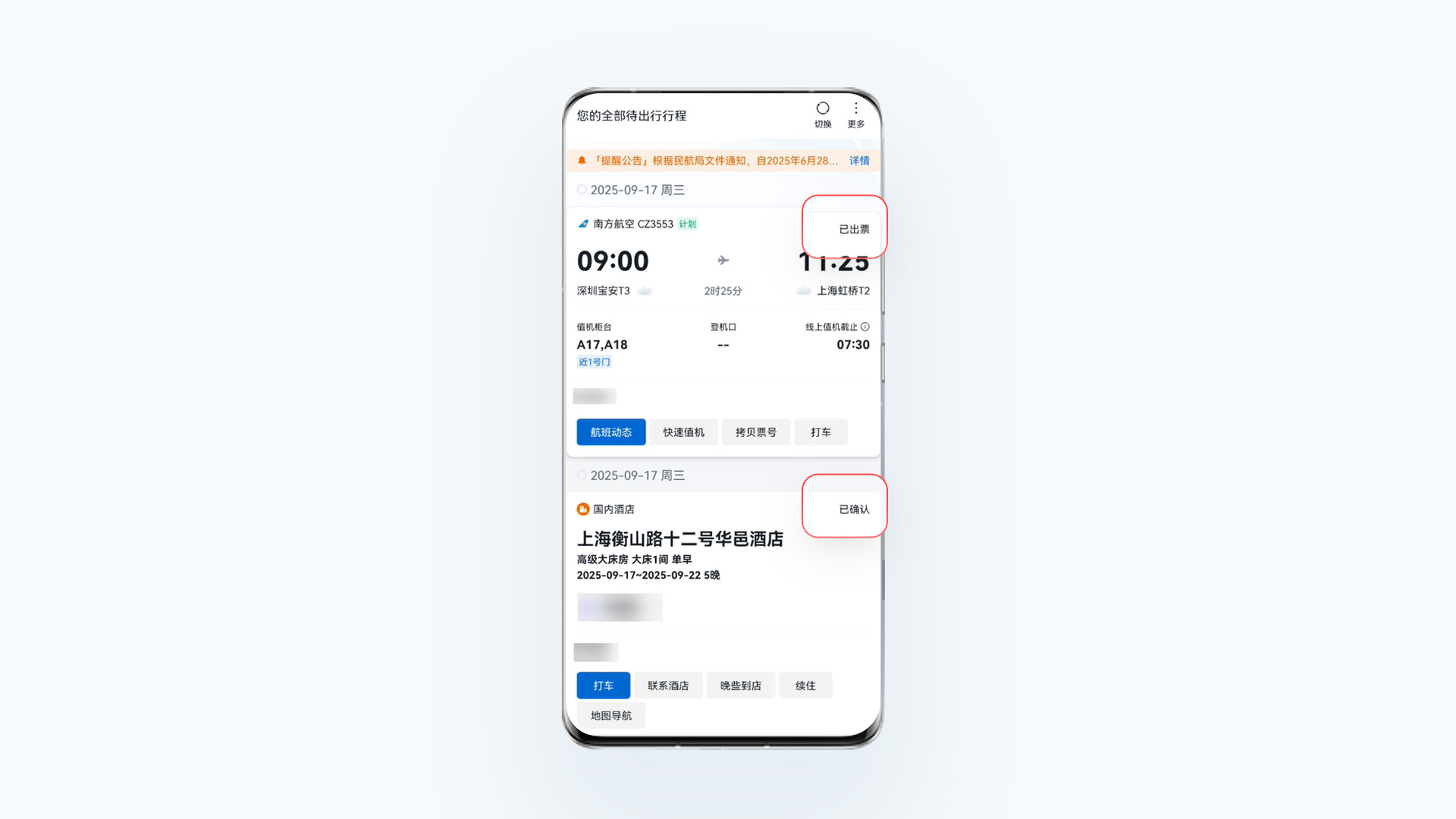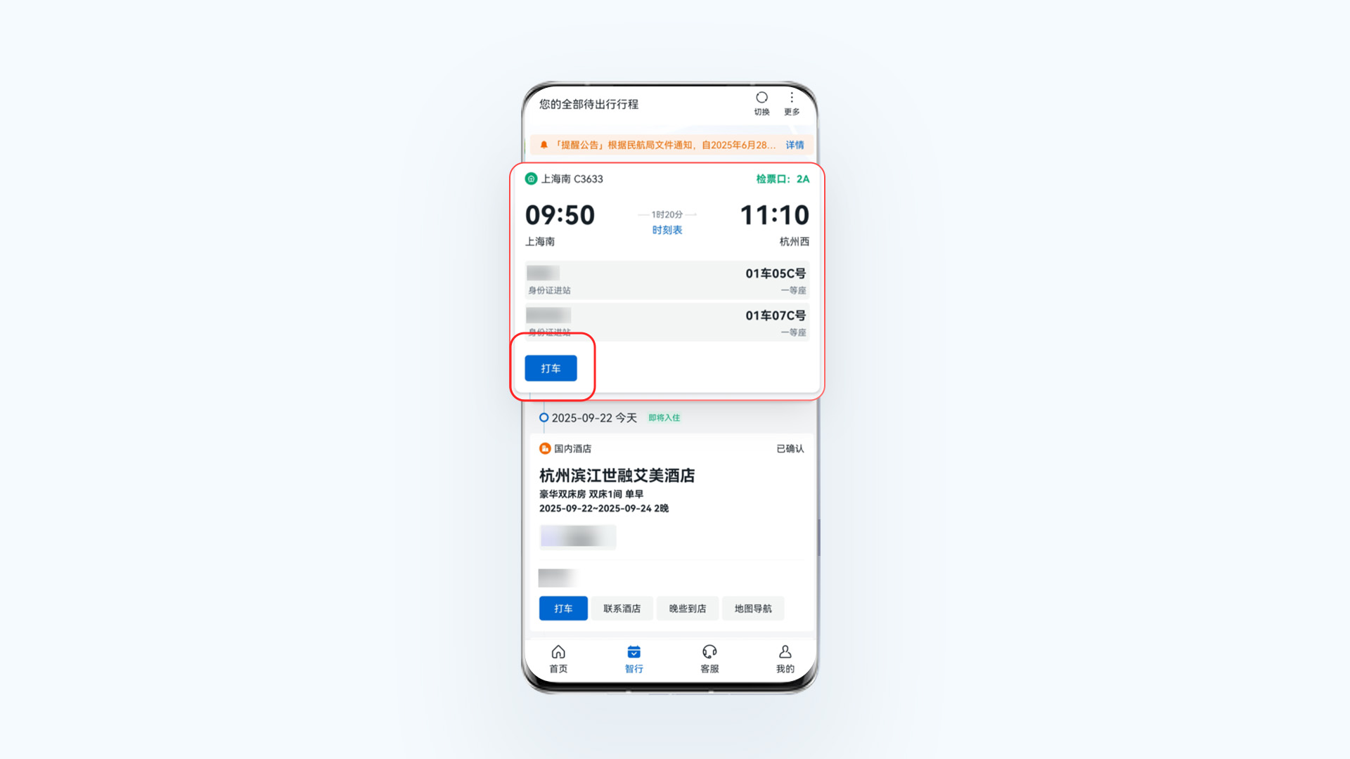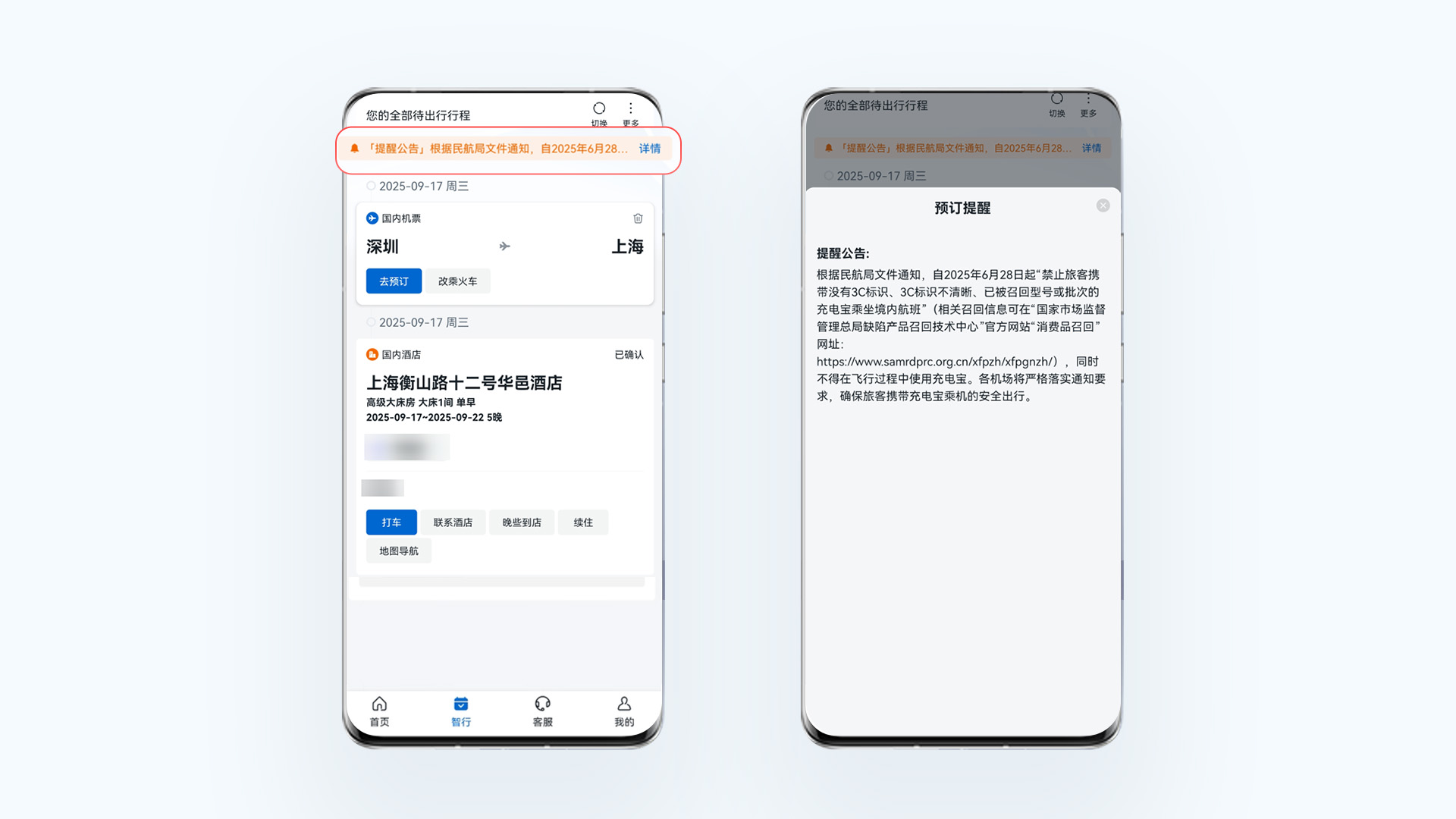 ④在预订行程之前,可通过“详情”查看预订提醒,提前做好出行准备,以免影响行程;