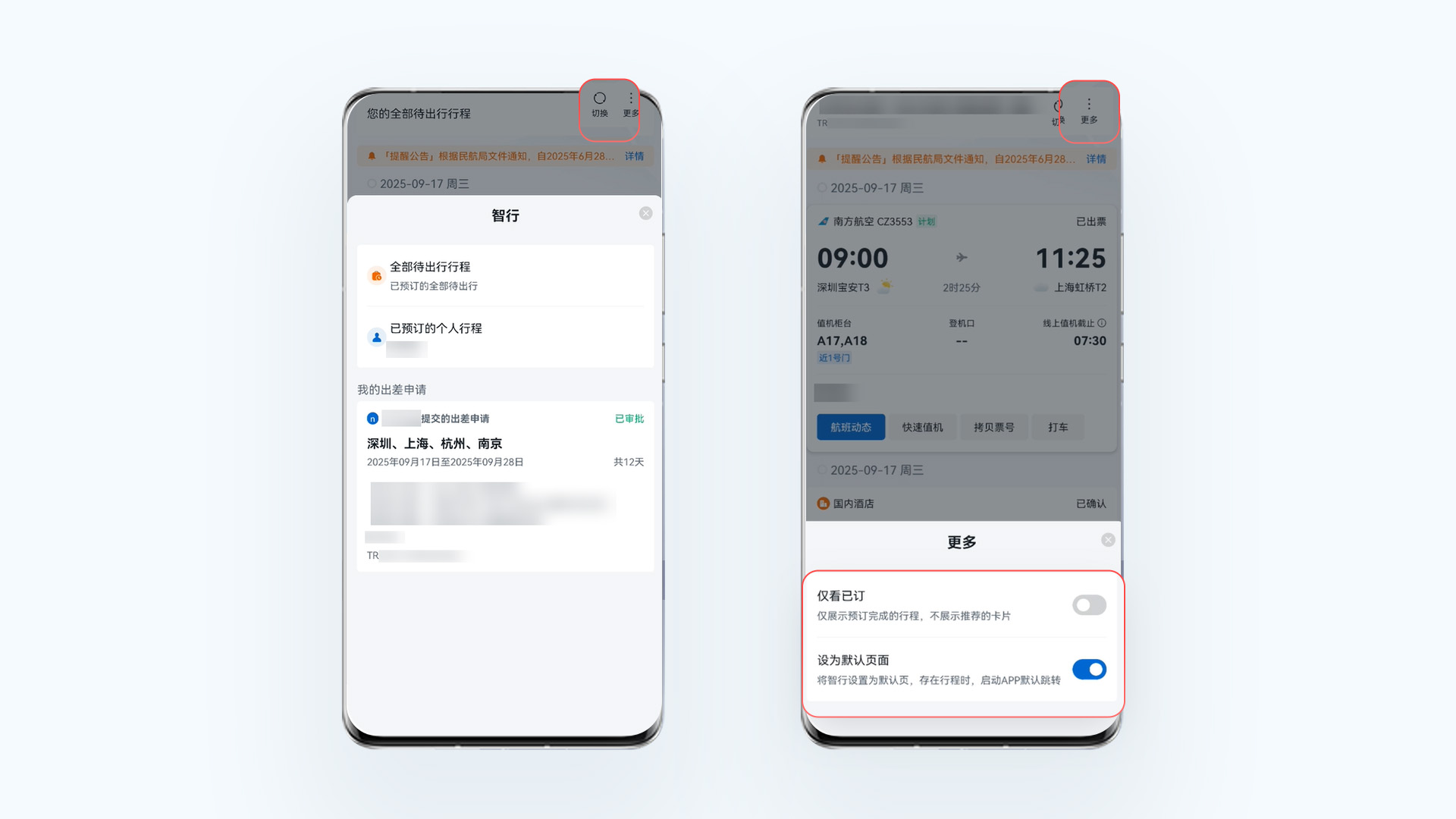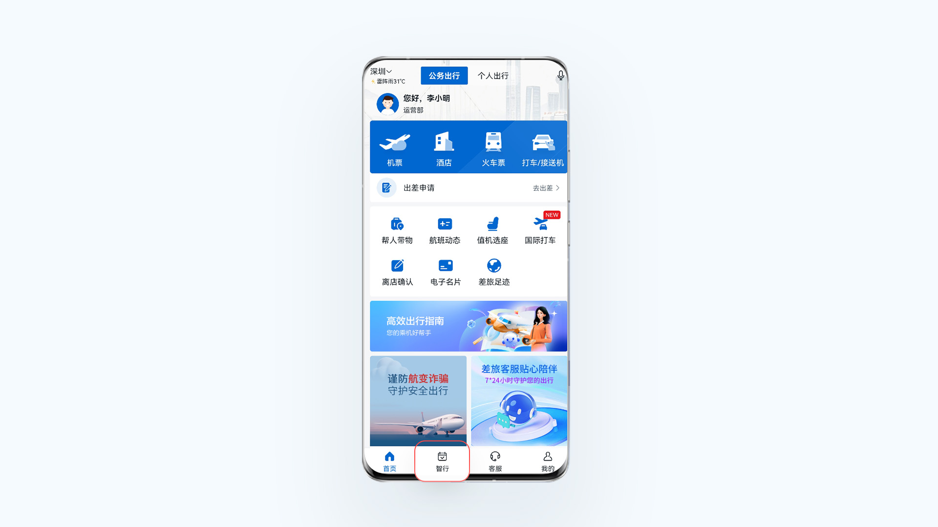 第一步:提交出差申请并完成审批后,通过首页进入“智行”列表。