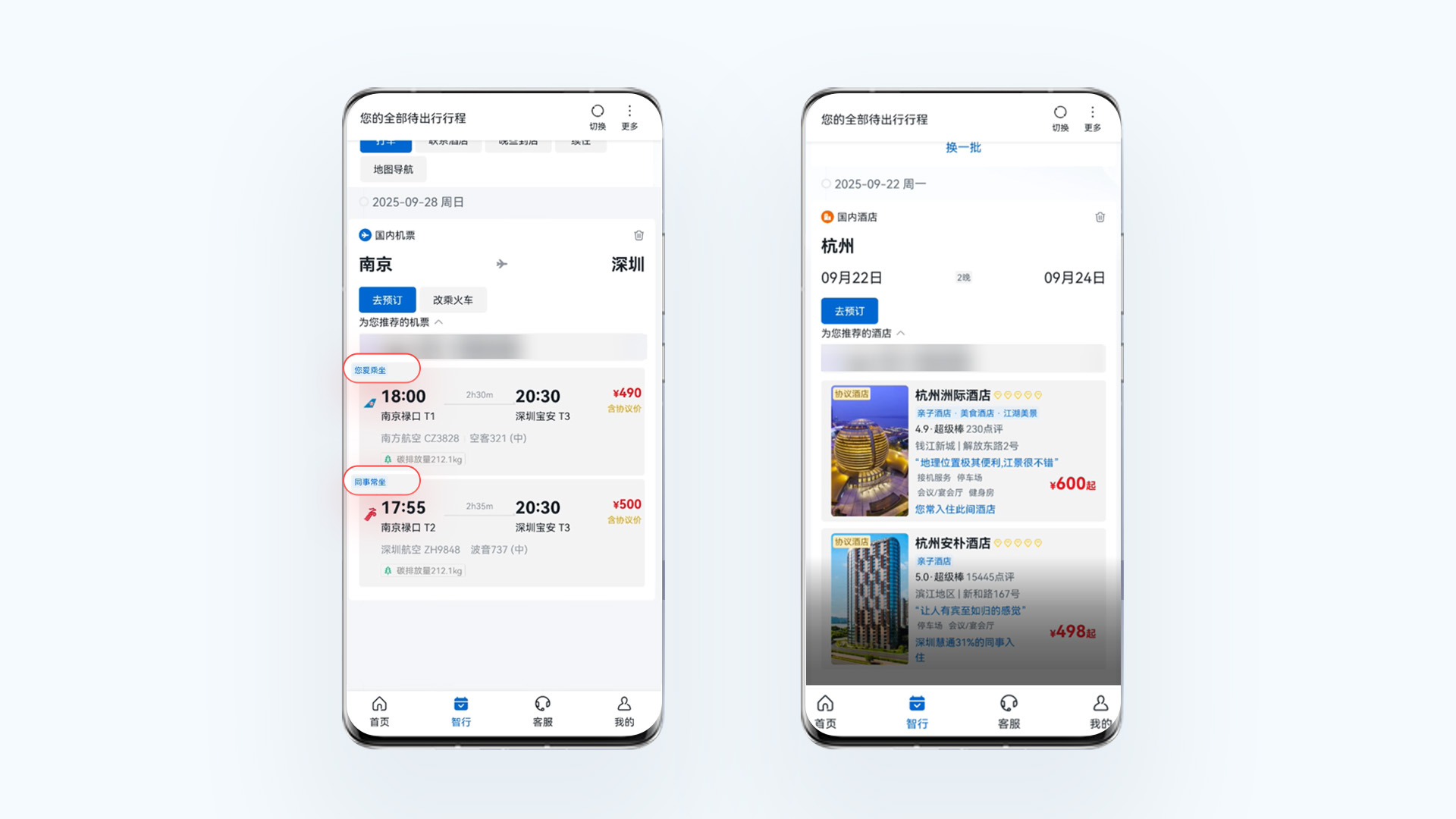 第二步:智行通过“同事常坐”、“同事入住”等推荐标签,智能为您规划最优的机票、酒店、火车票预订方案;也可直接点击“去预订”,按需自助预订行程。