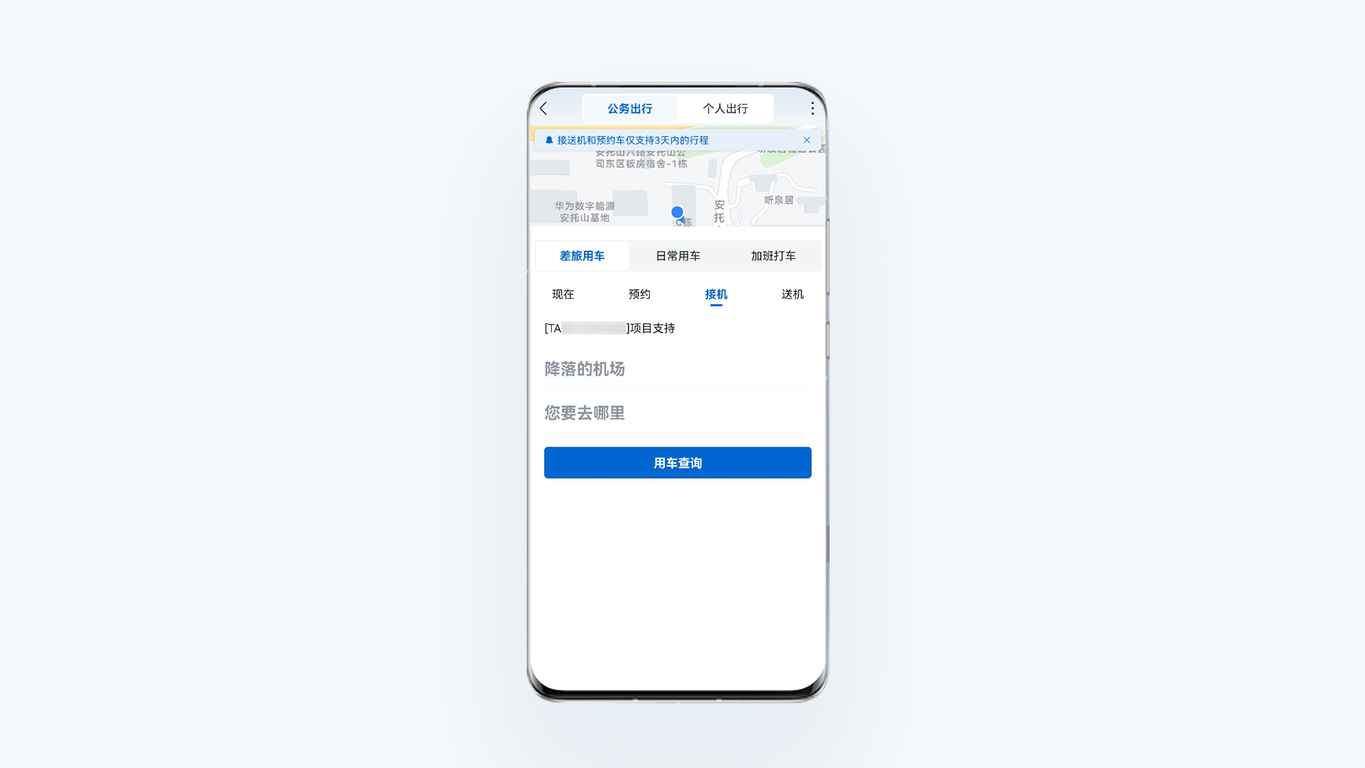 4)点击“打车”可进入用车界面,提前预约接送机服务。(操作流程参考公务用车即可)