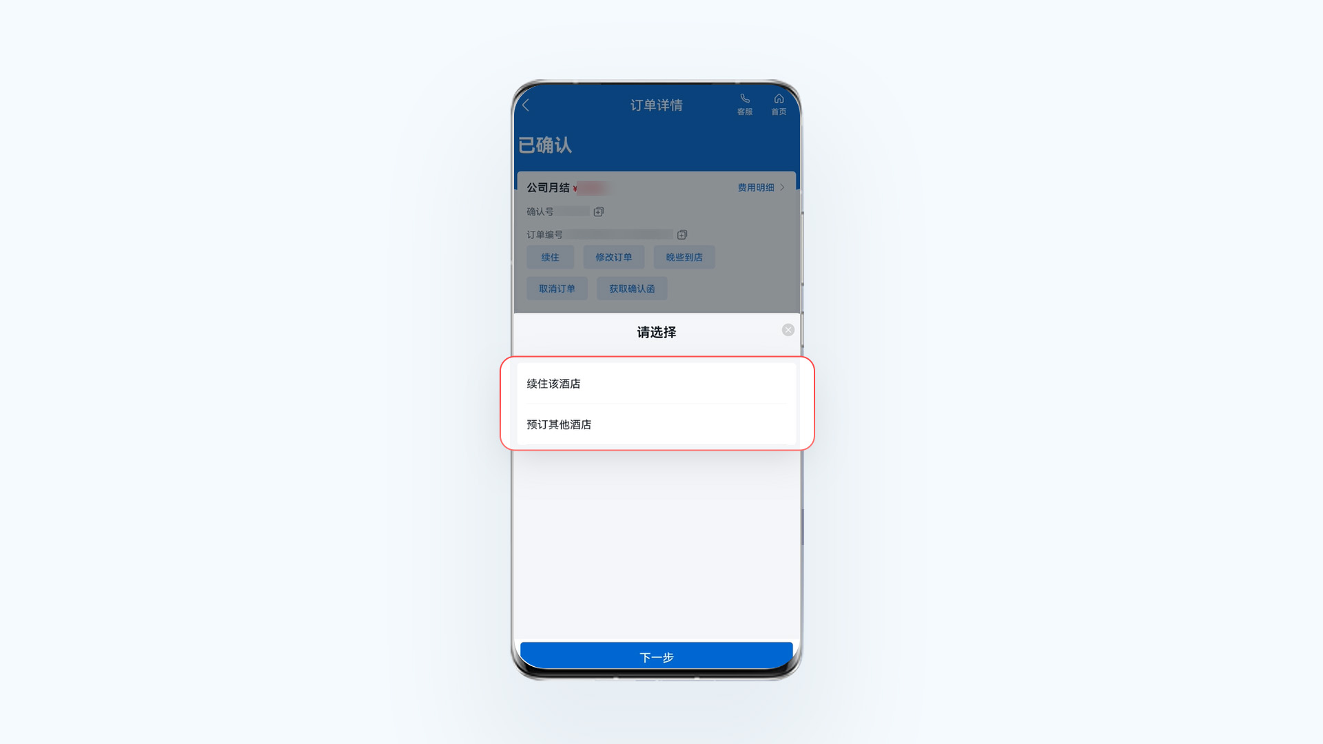 4)点击“续住”,可“续住该酒店”,如该酒店满房或有其他需求,可选择“预订其他酒店”;