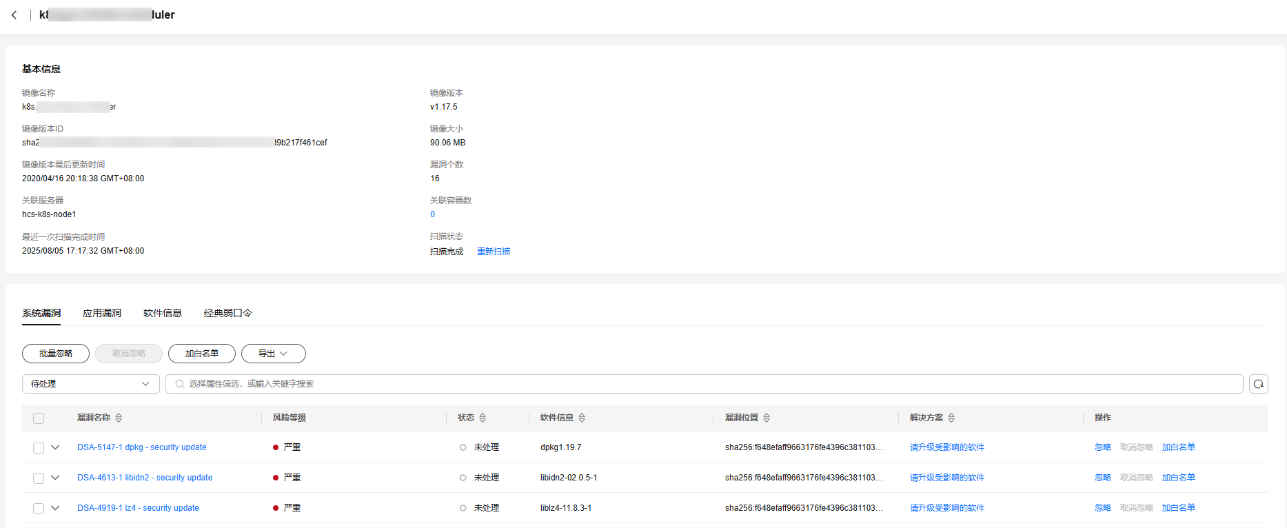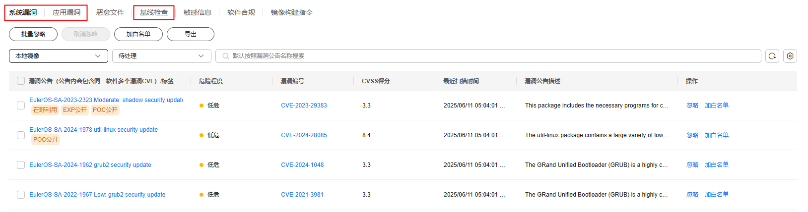 - 在“风险视图”,选择系统漏洞、应用漏洞以及,并筛选“本地镜像”,查看并处理本地镜像安全扫描结果。风险详细说明请参见表1。