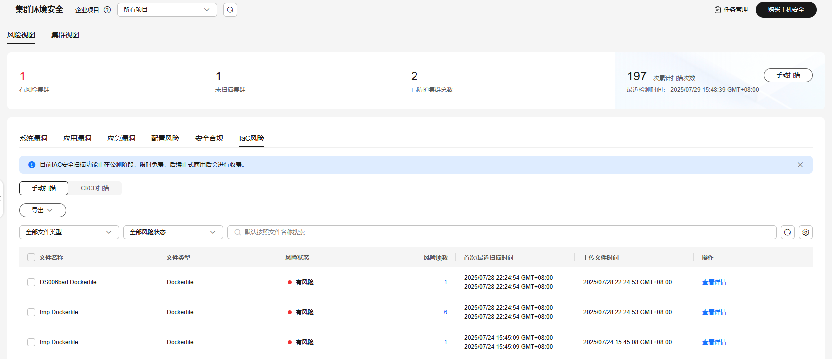 图6 IaC风险IaC风险扫描结果分为“手动扫描”和“CI/CD扫描”两个视图,“手动扫描”表示您在集群环境安全界面手动上传IaC文件扫描的结果,“CI/CD扫描”表示您将扫描插件集成到Jenkins项目中,构建项目时自动扫描IaC文件的结果。
