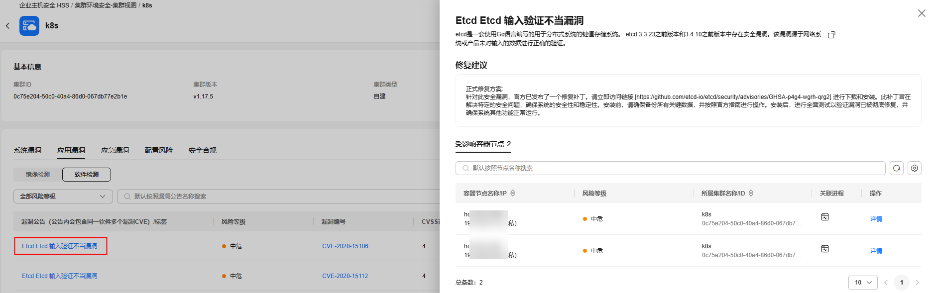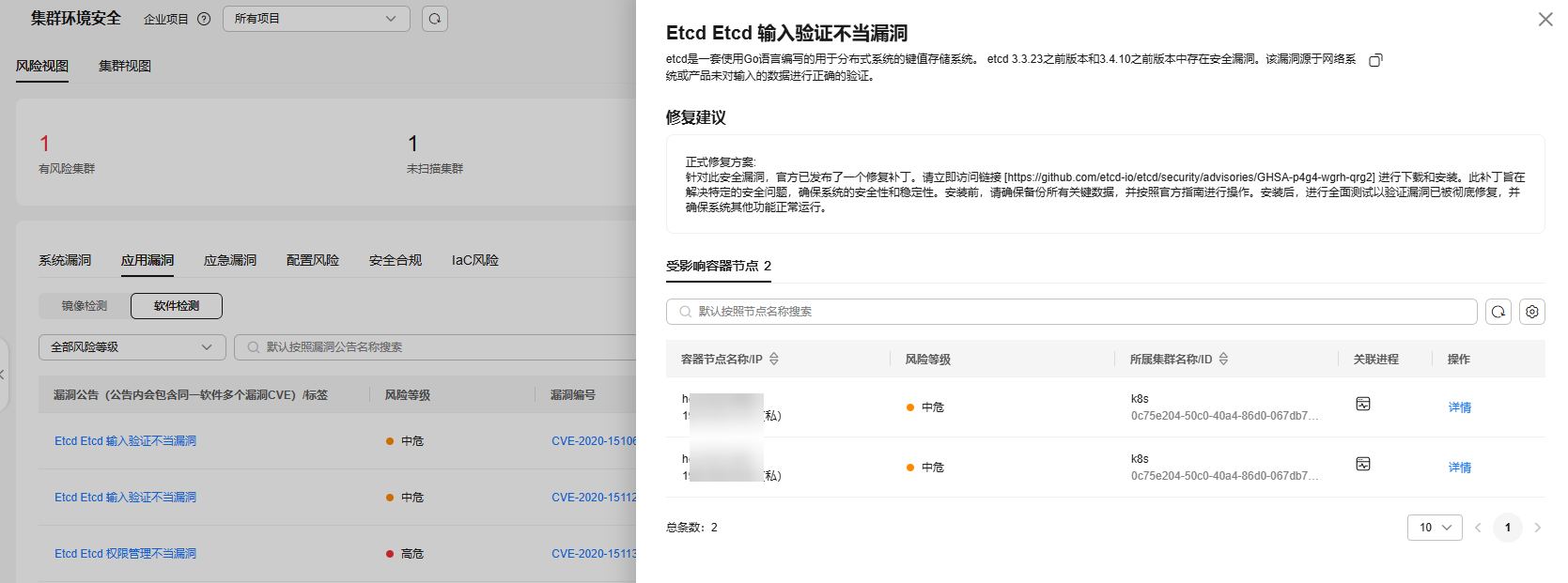 单击漏洞公告名称,进入漏洞详情页面,查看漏洞公告详细信息、修复建议以及受影响的容器或容器节点。您可以根据漏洞修复建议修复漏洞。