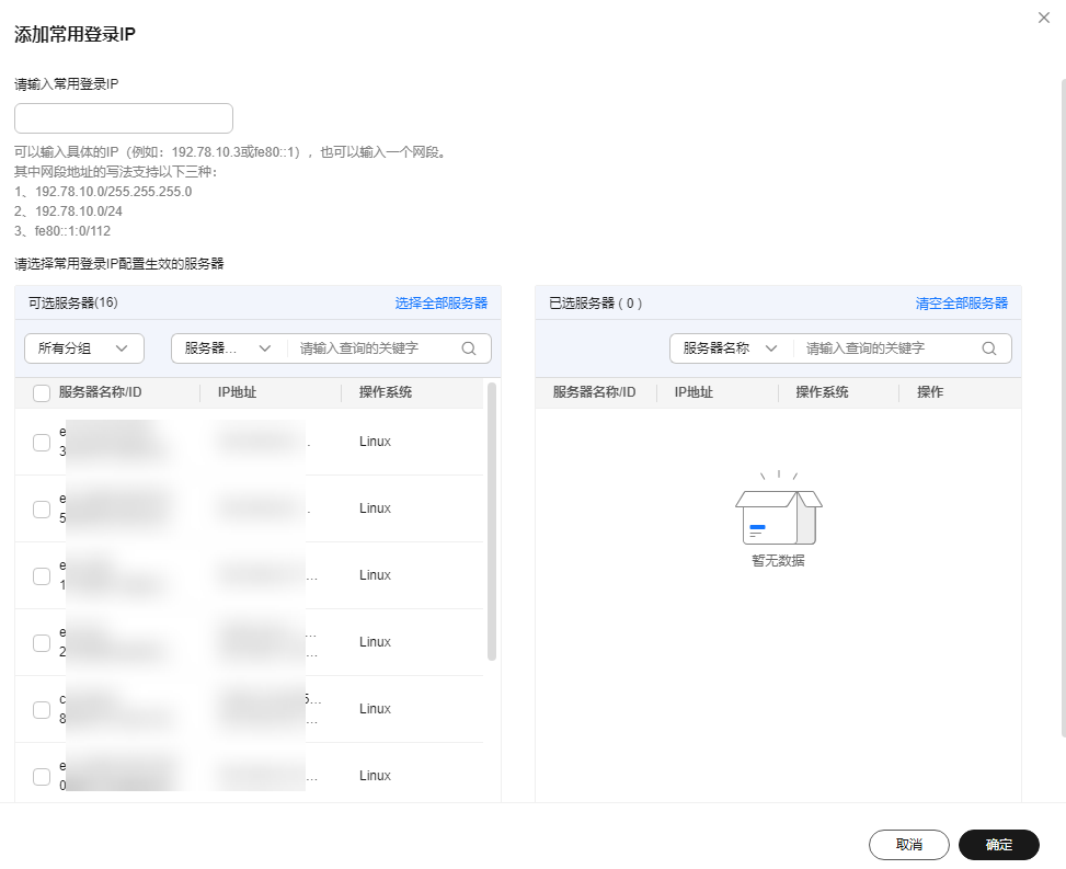 - 在弹出的对话框中输入“常用登录IP”,勾选需要生效的云服务器,确认无误单击“确定”,添加操作完成。相关参数说明请参见表1。