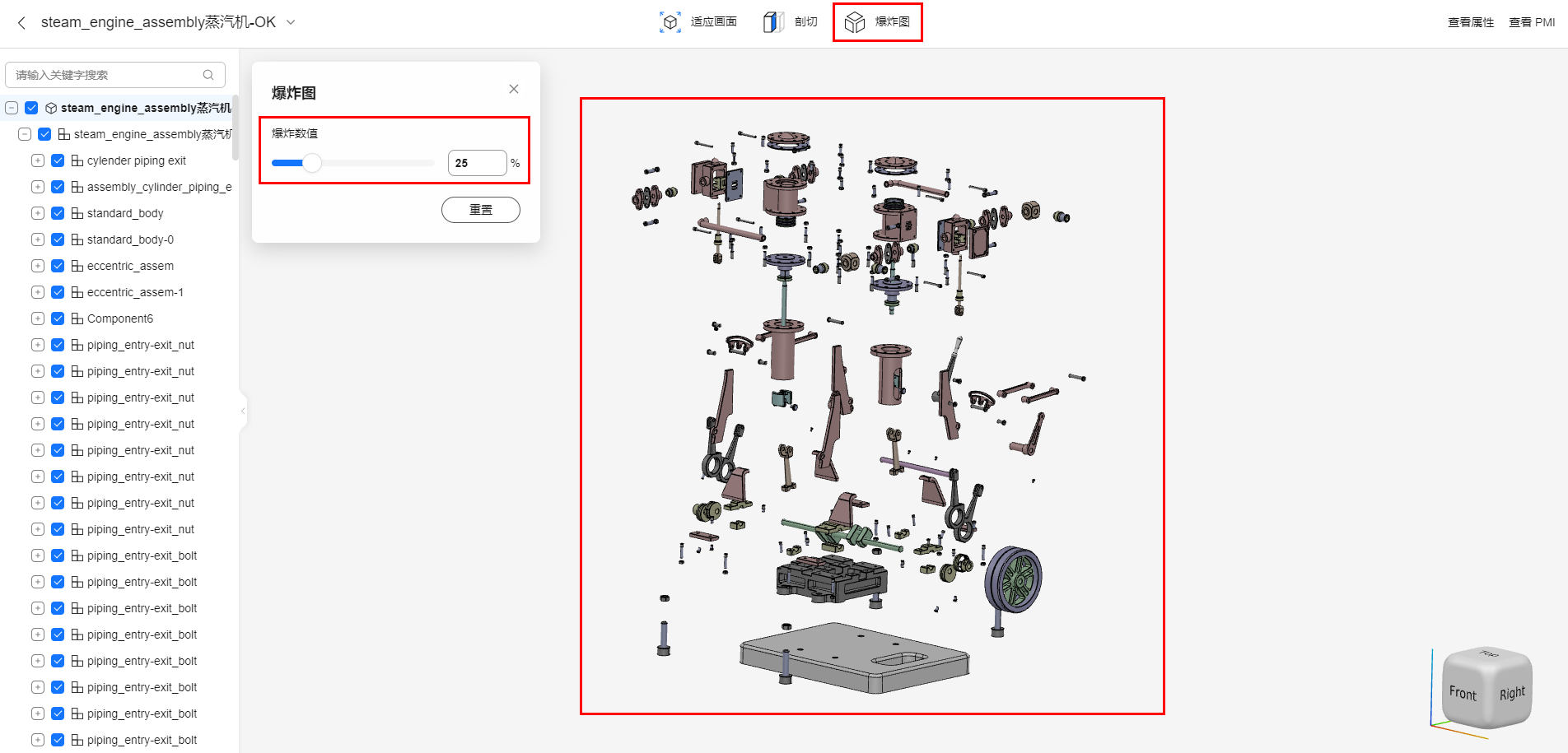 当您需要清除之前对模型的爆炸效果,可以通过“重置”使得模型的爆炸效果恢复到初始的可视化状态。