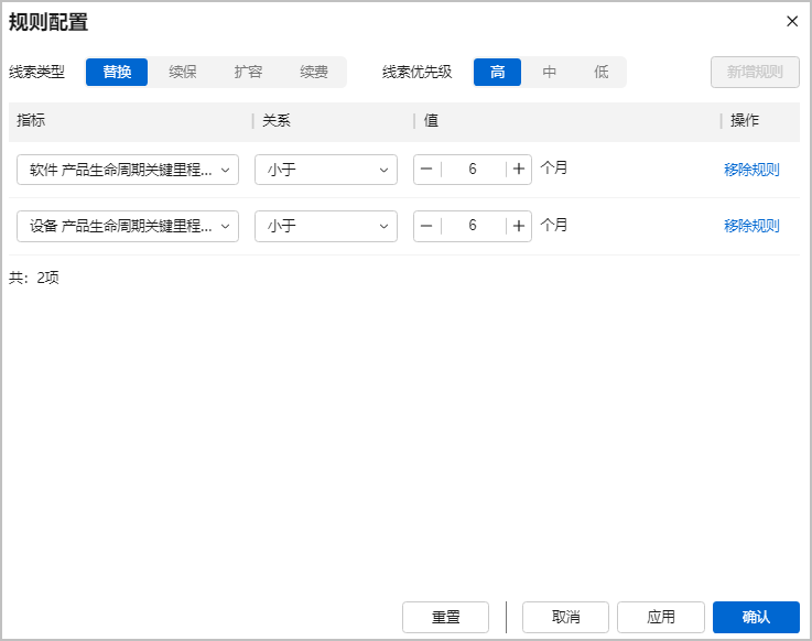 - 续保类线索指标:设备维保指标(例如:维保到期时间),高级别缺省值都为6个月,中级别缺省值都为12个月,低级别缺省值都为18个月。