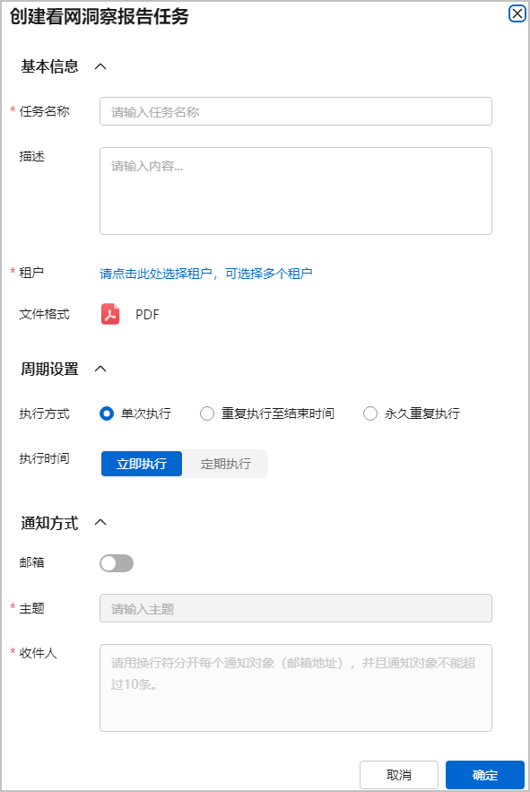 经营报告设置支持创建、修改、查看及删除看网洞察报告周期任务,支持选择租户,支持设置执行周期配置报告邮箱推送。