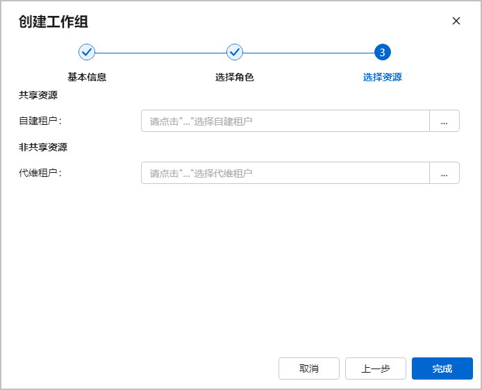 - 共享资源:当前主要指自建租户,同级工作组之间可共享,可分配给多个同级工作组。