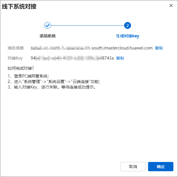 - 提交信息后,系统自动生成“域名信息”及“对接Key”,单击“复制”记录信息,登录线下系统配置该“域名信息”及“对接Key”,完成系统对接。