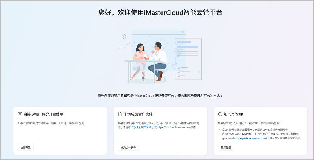 - 自注册开通租户:用户使用该Uniportal账号首次登录iMasterCloud智能云管平台,开通并成为普通租户管理员。