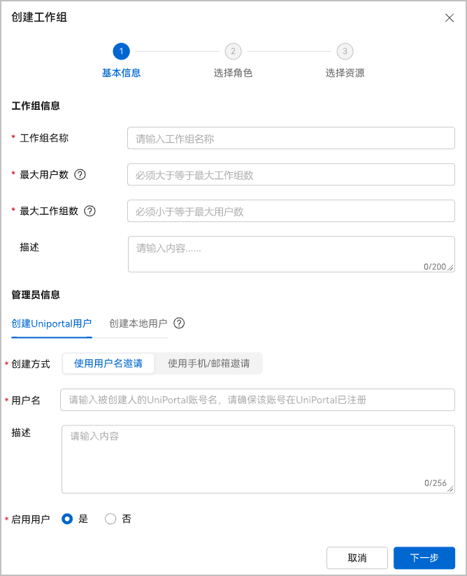 - 创建Uniportal用户管理员信息参数如表1所示,然后单击“下一步”。