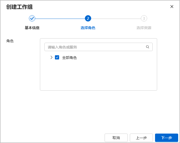 - 配置工作组管理员角色,单击“下一步”。角色列表缺省情况下继承当前登录的管理员账号所拥有的角色。如需分配自定义角色,请参见创建角色提前创建。