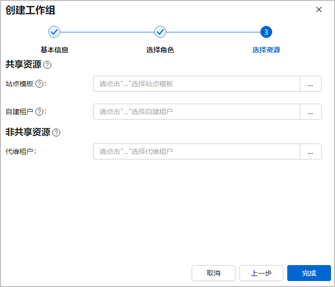 - 配置工作组的管理资源,完成选择后单击“完成”。