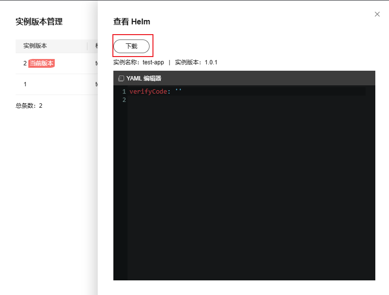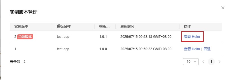- 实例版本管理展示该实例部署的当前及历史版本,单击”查看Helm”可以查看指定版本的Helm信息,并且可以下载指定版本的Helm。
