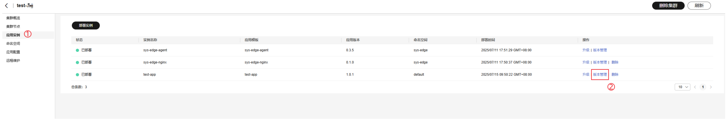 - 选择“应用实例”,在选择的应用实例右侧,单击“版本管理”。