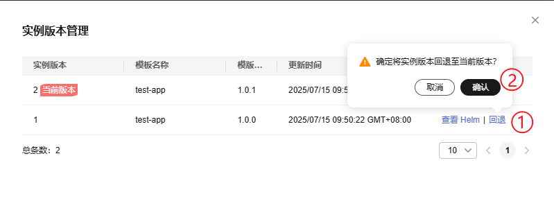 - 如果需要将当前版本回退到某一历史版本,选择指定的版本,单击”回退”并”确认”,可以完成版本回退。