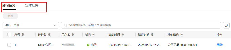 图2 后台任务管理页面- 分区平衡任务启动后,不能删除正在进行分区平衡的Topic,否则会导致分区平衡任务无法结束。