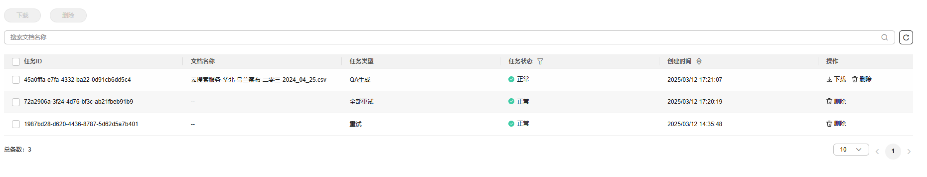 在“文档管理”页签单击“QA生成”、“重试”的任务,都可以在任务管理中查看。“QA生成”的文件可以下载、删除。“重试”生成的任务只支持删除。