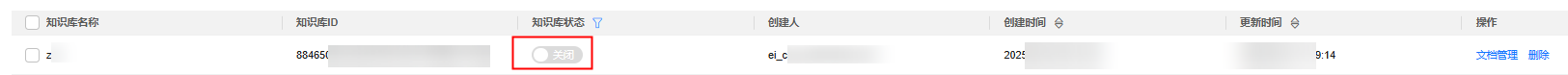 - 选择知识库,在“知识库状态”列,关闭开关,使知识库状态处于“关闭”状态。