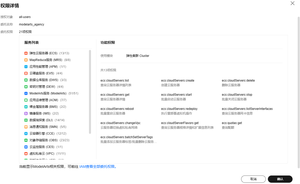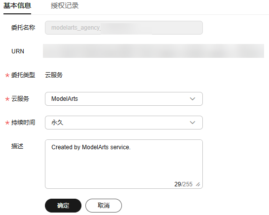 - 授权对象类型为其他对象类型时,默认委托名称为modelarts_agency。