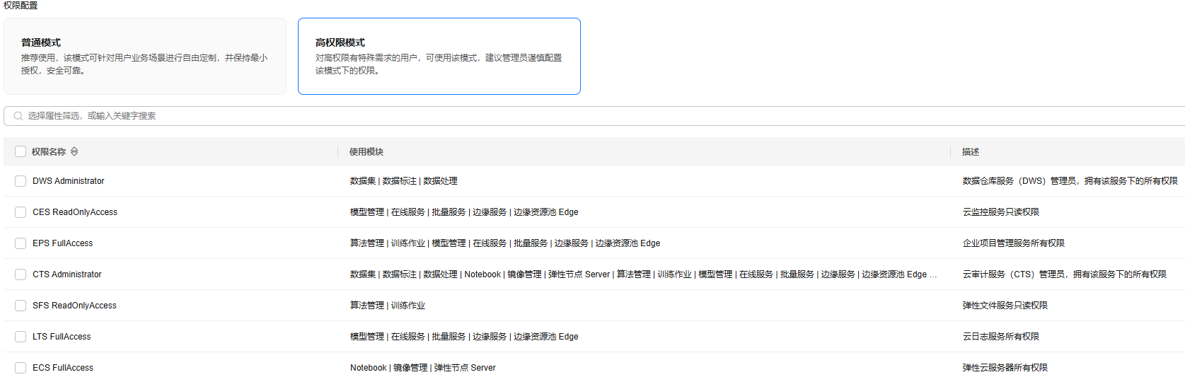普通模式下配置权限,该模式可针对用户业务场景进行自由定制,并保持最小授权,安全可靠。
