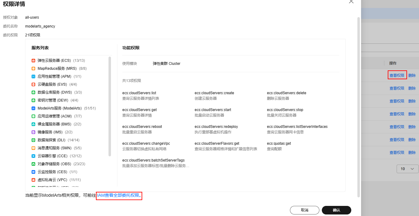 - 在查看授权详情时,如果想要修改授权范围,可以在权限详情页单击“IAM查看全部委托权限”。