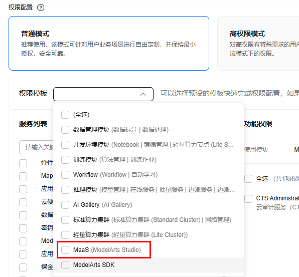 在“权限模板”下拉框选择“MaaS(ModelArts Studio)”。