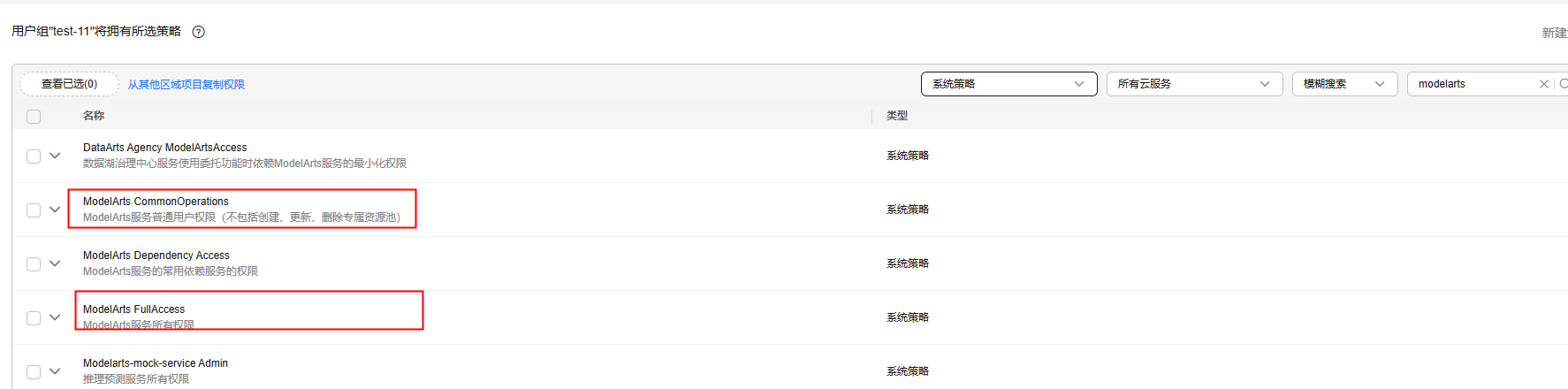 - 配置ModelArts使用权限。选择系统策略,然后在搜索框搜索ModelArts。ModelArts FullAccess权限和ModelArts CommonOperations权限建议二选一。
