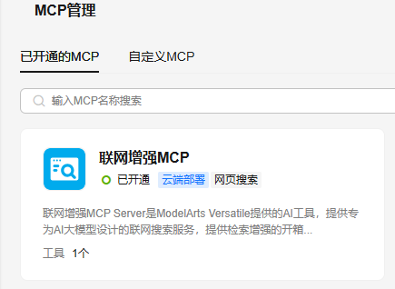 - 在“MCP管理”页面的“已开通的MCP”页签,查看所有已开通的MCP服务。