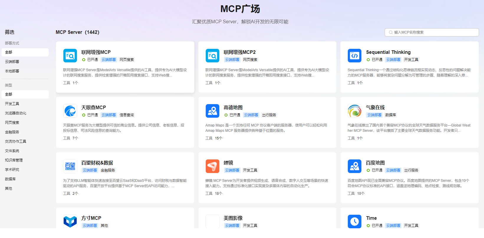 MCP广场汇聚了优质的MCP服务,可以扩展应用能力。您可以在MCP广场左侧筛选区域,按需选择部署方式和类型。
