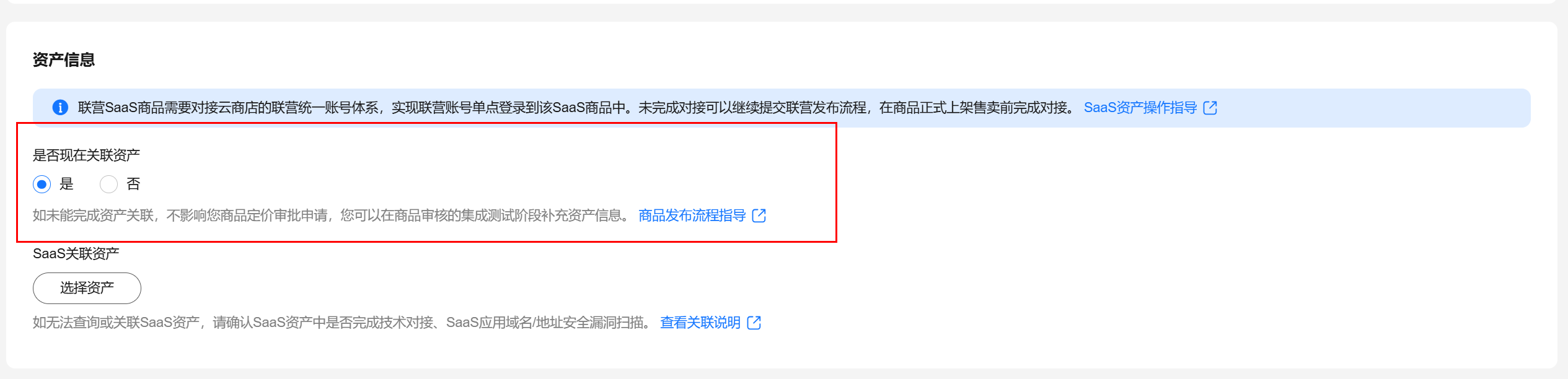 联营SaaS商品需要对接云商店的联营统一账号体系,实现联营账号单点登录到该SaaS商品中。未完成对接可以先选“否”继续提交联营发布流程,在商品正式上架售卖前完成对接,具体接入操作请参见:《管理SaaS类资产》;