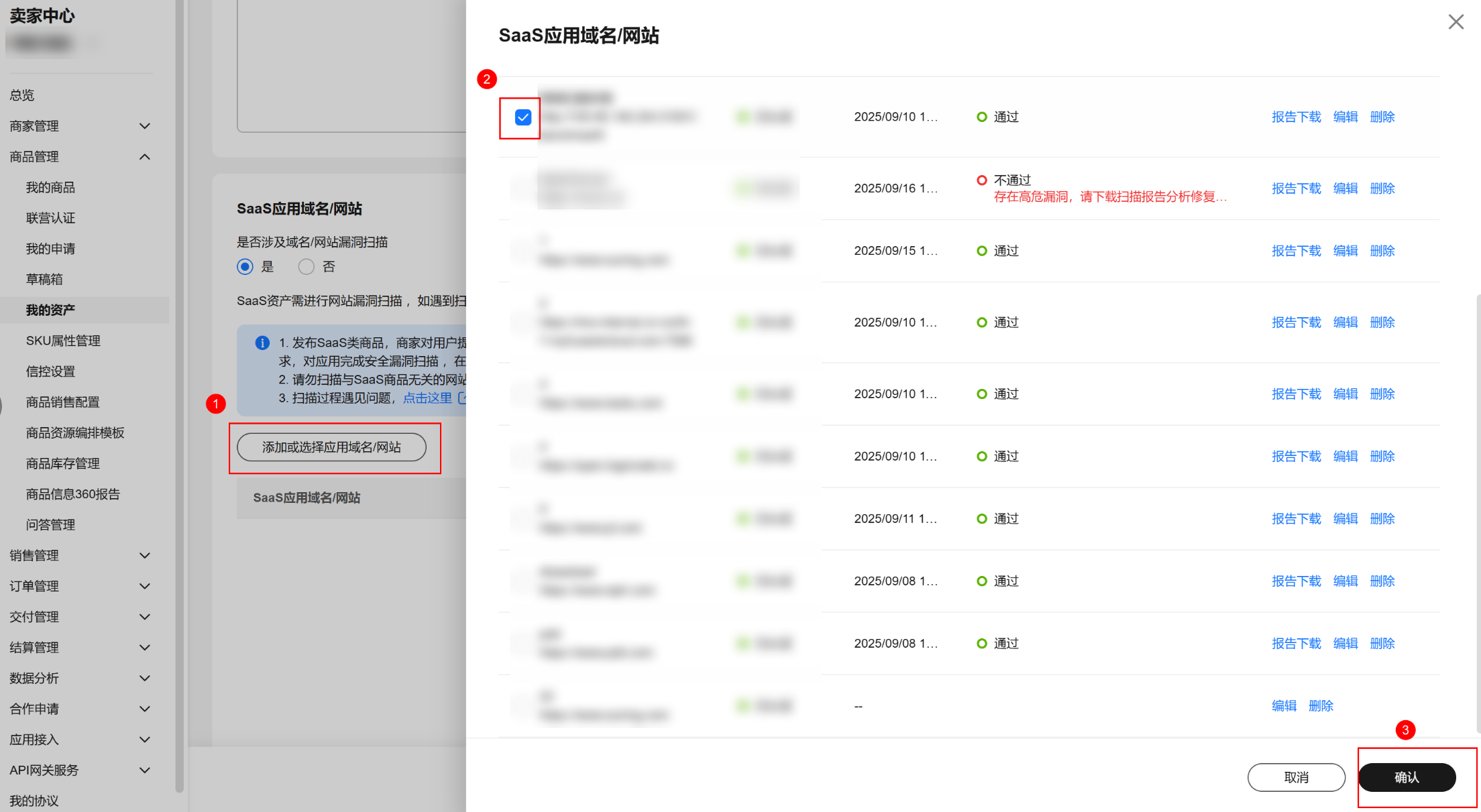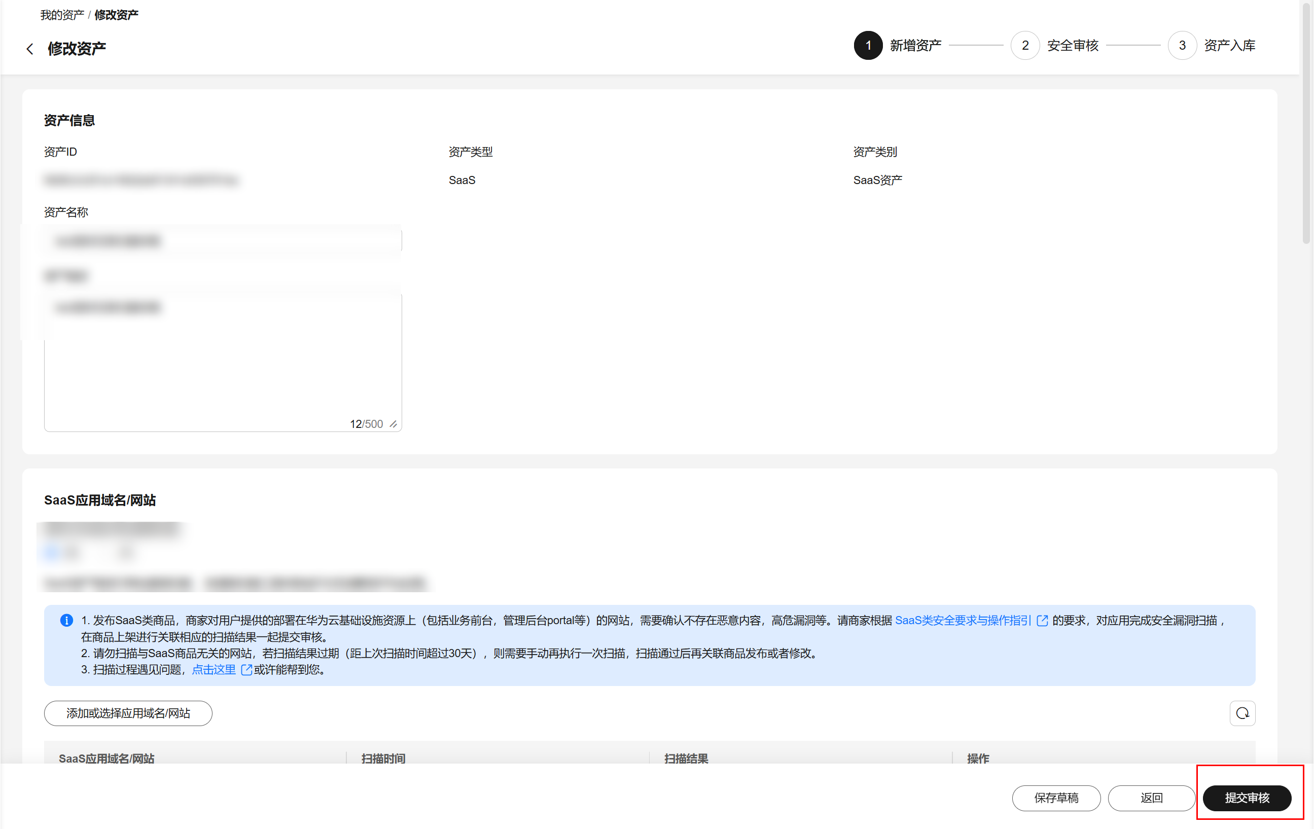 - 当资产状态为“已驳回”,请点击“详情”进入资产详情页面,下拉至“SaaS应用域名/网站”,下载查看“安全扫描报告”。