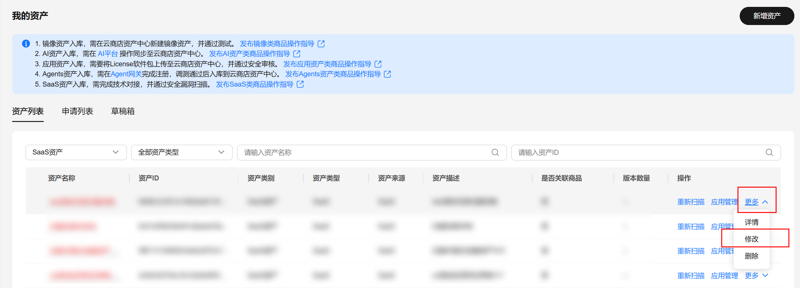 为便于商家统一管理软件资产,云商店构建了资产中心平台,商家可以在资产中心进行新增资产、修改资产、删除资产等操作。