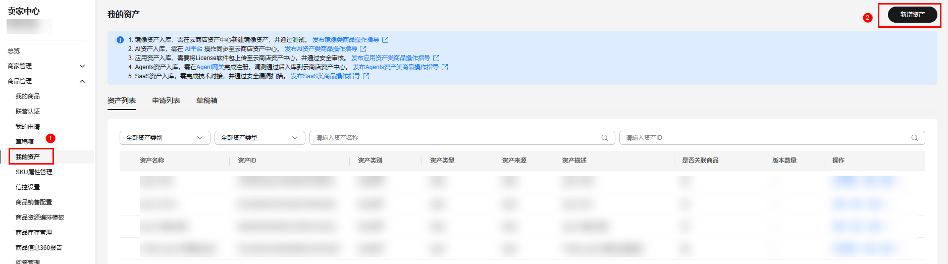 - 点击左侧导航栏的“商品管理>我的资产”,点击页面右上角的“新增资产”。