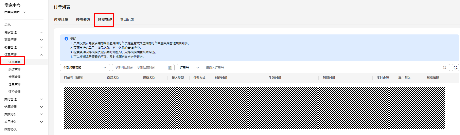 进入交易管理>订单列表>续费管理页面,查看订单信息: