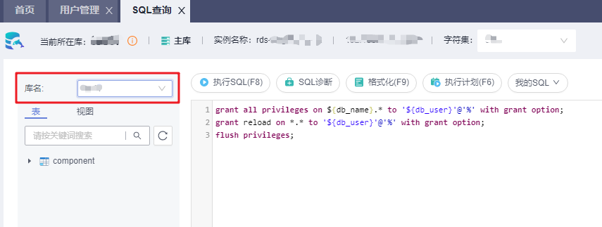 - 在页面顶部选择“SQL操作 > SQL查询”,在“库名”处切换对应数据库,然后执行如下SQL命令为该数据库用户进行赋权,其中${db_name}与${db_user}为MRS待连接的数据库名和新建的用户名。