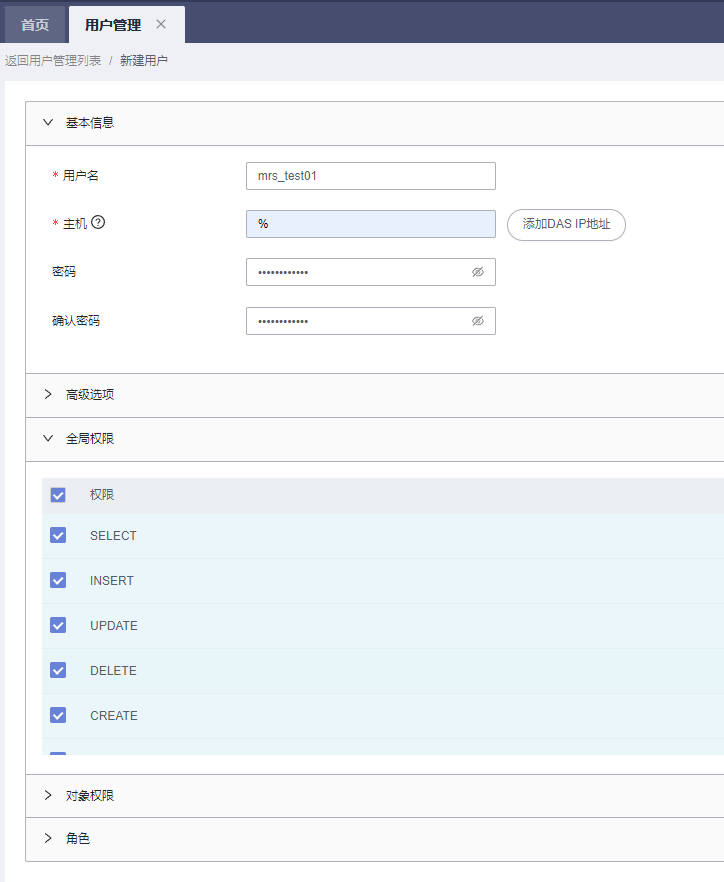 - 单击“新建用户”,创建一个非root用户,并勾选“全局权限”中所有的权限,其他参数根据实际需要配置。