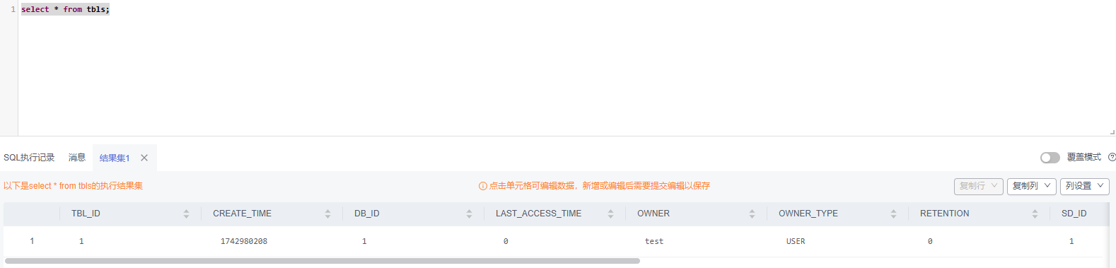 - 在对接的RDS MySQL实例的数据库的“SQL查询”页面执行以下命令: