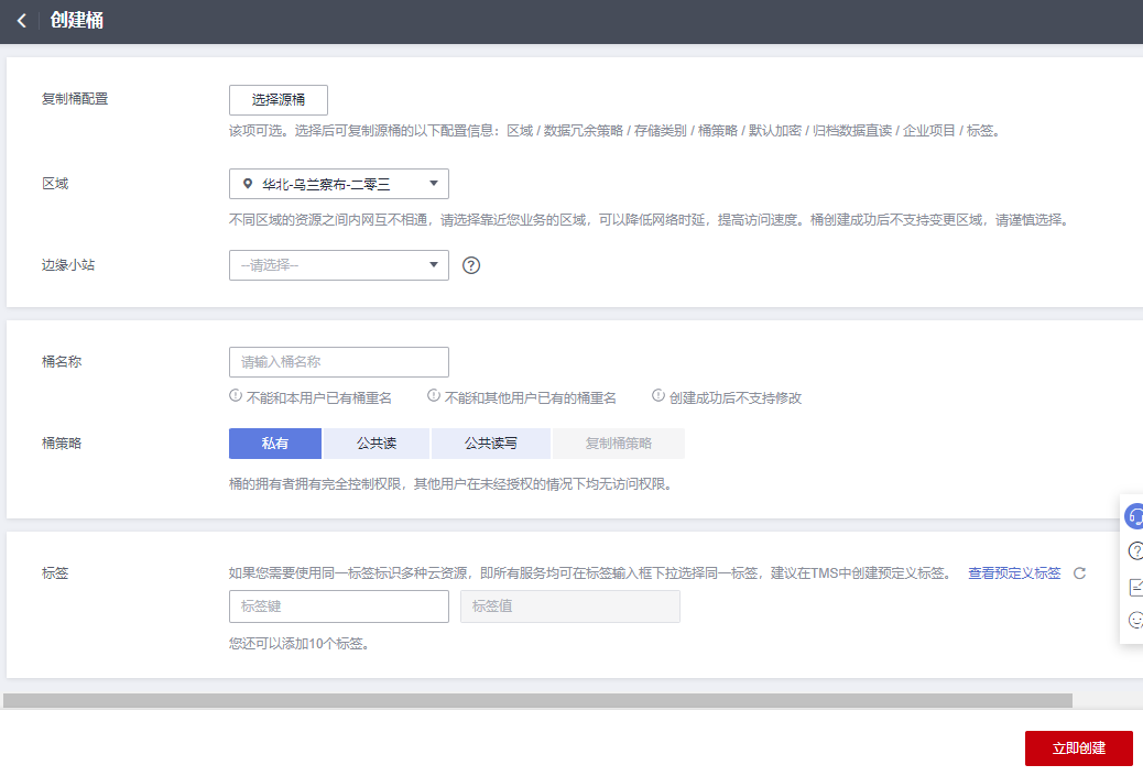 - 在页面右上角单击“创建桶”,系统弹出如图1所示的页面。