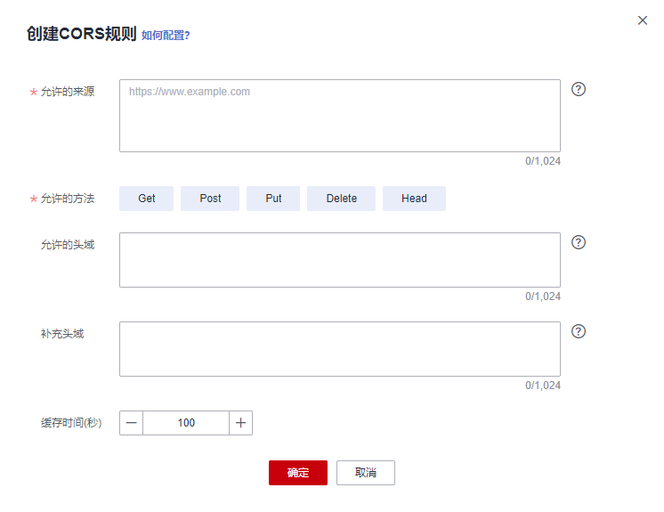 - 在“CORS规则”中配置“允许的来源”、“允许的方法”、“允许的头域”、“补充头域”和“缓存时间”。