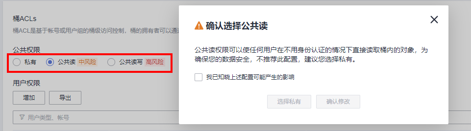 - 私有权限切换公共读权限,可以使任何用户在不用身份认证的情况下直接读取桶内的对象,请谨慎操作。