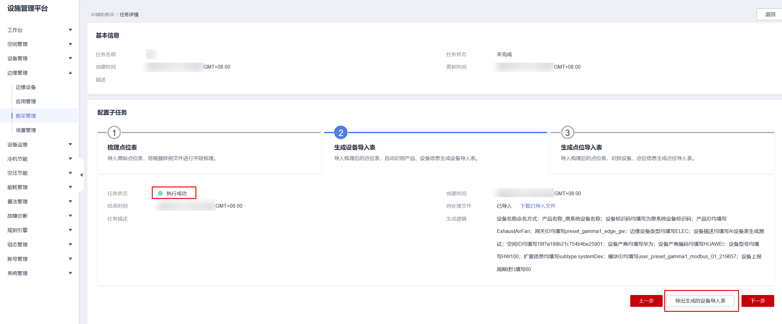 - 任务执行成功后,单击“导出生成的设备导入表”进行下载。