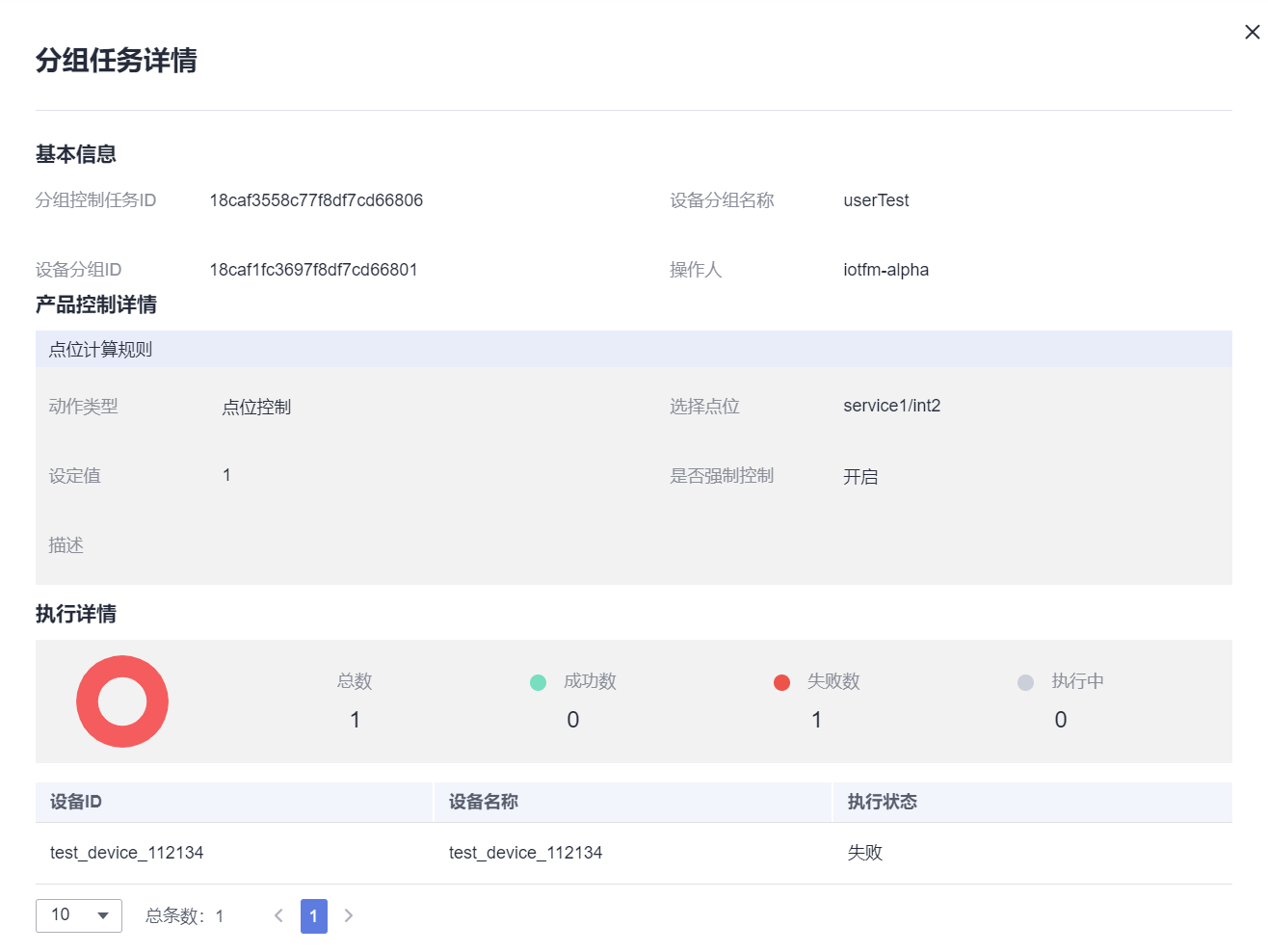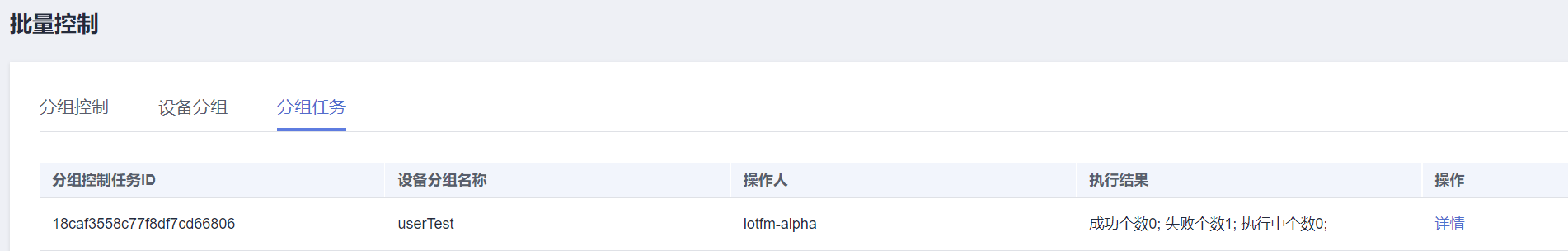 - 查看userTest任务执行情况,单击详情可查看任务中设备执行情况。