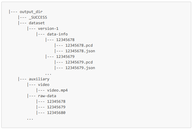 docker run -v ${HOME}/data/20220620.bag:/tmp/data/20220620.bag -v ${HOME}/tmp/output:/tmp/output --env output_dir=/tmp/output --env rosbag_path=/tmp/data/20220620.bag --env tmp_dir=/tmp/workspace ros-to-dataset:0.1 /bin/sh -c “python3 /home/main/ros_to_dataset.py --topic pandar --type pcd”完成后在${HOME}/tmp/output目录查看运行结果文件: