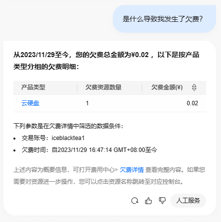 - 输入问题:在对话框中输入问题,例如:“是什么导致我发生了欠费?”;