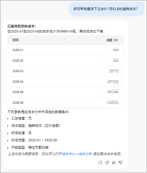 - 输入问题:在问答窗口中输入问题,例如:“按月帮我查询下过去6个月ELB的摊销成本?”。