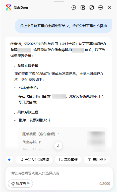 - 输入问题:在对话框中输入问题,例如:“我上个月能开票的金额比账单少,帮我分析下是怎么回事”;